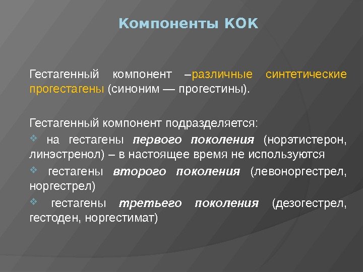 Компоненты КОК Гестагенный компонент – различные синтетические прогестагены (синоним — прогестины). Гестагенный компонент подразделяется: на гестагены первого поколения (норэтистерон, линэстренол) – в настоящее время не используются гестагены второго поколения (левоноргестрел, норгестрел) гестагены третьего поколения (дезогестрел, гестоден, норгестимат)