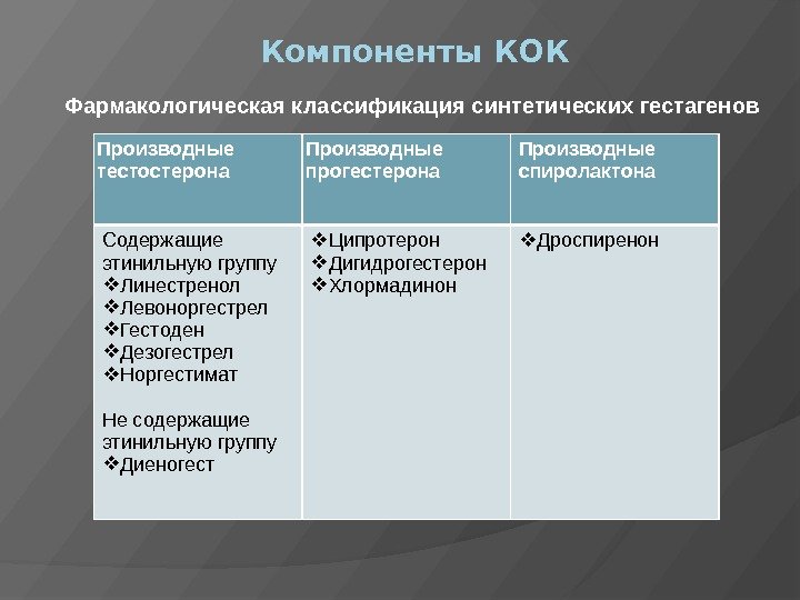 Компоненты КОК Фармакологическая классификация синтетических гестагенов Производные тестостерона Производные прогестерона Производные спиролактона Содержащие этинильную группу Линестренол Левоноргестрел Гестоден Дезогестрел Норгестимат Не содержащие этинильную группу Диеногест Ципротерон Дигидрогестерон Хлормадинон Дроспиренон