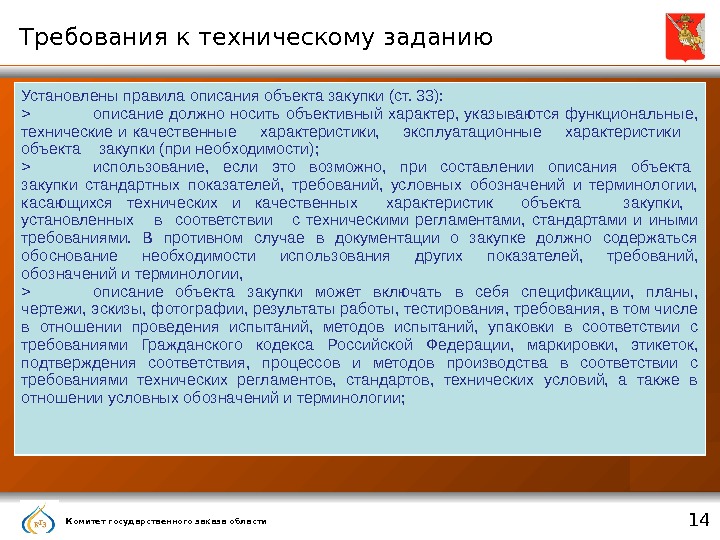 Комитет государственного заказа области 14 Требования к техническому заданию Установлены правила описания объекта закупки (ст. 33): > описание должно носить объективный характер, указываются функциональные, технические и качественные характеристики, эксплуатационные характеристики объекта закупки (при необходимости); > использование, если это возможно, при составлении описания объекта закупки стандартных показателей, требований, условных обозначений и терминологии, касающихся технических и качественных характеристик объекта закупки, установленных в соответствии с техническими регламентами, стандартами и иными требованиями. В противном случае в документации о закупке должно содержаться обоснование необходимости использования других показателей, требований, обозначений и терминологии, > описание объекта закупки может включать в себя спецификации, планы, чертежи, эскизы, фотографии, результаты работы, тестирования, требования, в том числе в отношении проведения испытаний, методов испытаний, упаковки в соответствии с требованиями Гражданского кодекса Российской Федерации, маркировки, этикеток, подтверждения соответствия, процессов и методов производства в соответствии с требованиями технических регламентов, стандартов, технических условий, а также в отношении условных обозначений и терминологии;