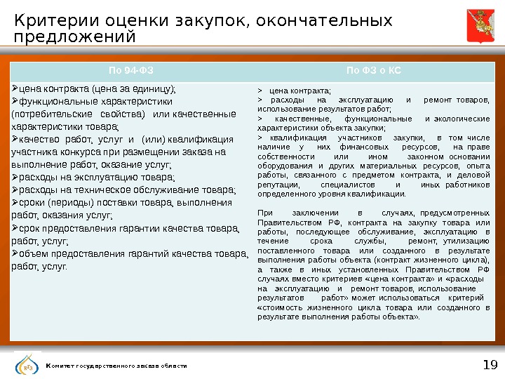 Комитет государственного заказа области 19 Критерии оценки закупок, окончательных предложений По 94 -ФЗ По ФЗ о КС цена контракта (цена за единицу); функциональные характеристики (потребительские свойства) или качественные характеристики товара; качество работ, услуг и (или) квалификация участника конкурса при размещении заказа на выполнение работ, оказание услуг; расходы на эксплуатацию товара; расходы на техническое обслуживание товара; сроки (периоды) поставки товара, выполнения работ, оказания услуг; срок предоставления гарантии качества товара, работ, услуг; объем предоставления гарантий качества товара, работ, услуг. > цена контракта; > расходы на эксплуатацию и ремонт товаров, использование результатов работ; > качественные, функциональные и экологические характеристики объекта закупки; > квалификация участников закупки, в том числе наличие у них финансовых ресурсов, на праве собственности или ином законном основании оборудования и других материальных ресурсов, опыта работы, связанного с предметом контракта, и деловой репутации, специалистов и иных работников определенного уровня квалификации. При заключении в случаях, предусмотренных Правительством РФ, контракта на закупку товара или работы, последующее обслуживание, эксплуатацию в течение срока службы, ремонт, утилизацию поставленного товара или созданного в результате выполнения работы объекта (контракт жизненного цикла), а также в иных установленных Правительством РФ случаях вместо критериев «цена контракта» и «расходы на эксплуатацию и ремонт товаров, использование результатов работ» может использоваться критерий «стоимость жизненного цикла товара или созданного в результате выполнения работы объекта» .