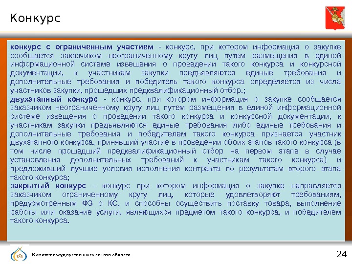 Комитет государственного заказа области 24 Конкурс конкурс с ограниченным участием — конкурс, при котором информация о закупке сообщается заказчиком неограниченному кругу лиц путем размещения в единой информационной системе извещения о проведении такого конкурса и конкурсной документации, к участникам закупки предъявляются единые требования и дополнительные требования и победитель такого конкурса определяется из числа участников закупки, прошедших предквалификационный отбор. ; двухэтапный конкурс — конкурс, при котором информация о закупке сообщается заказчиком неограниченному кругу лиц путем размещения в единой информационной системе извещения о проведении такого конкурса и конкурсной документации, к участникам закупки предъявляются единые требования либо единые требования и дополнительные требования и победителем такого конкурса признается участник двухэтапного конкурса, принявший участие в проведении обоих этапов такого конкурса (в том числе прошедший предквалификационный отбор на первом этапе в случае установления дополнительных требований к участникам такого конкурса) и предложивший лучшие условия исполнения контракта по результатам второго этапа такого конкурса; закрытый конкурс — конкурс при котором информация о закупке направляется заказчиком ограниченному кругу лиц, которые удовлетворяют требованиям, предусмотренным ФЗ о КС, и способны осуществить поставку товара, выполнение работы или оказание услуги, являющихся предметом такого конкурса, и победителем такого конкурса.