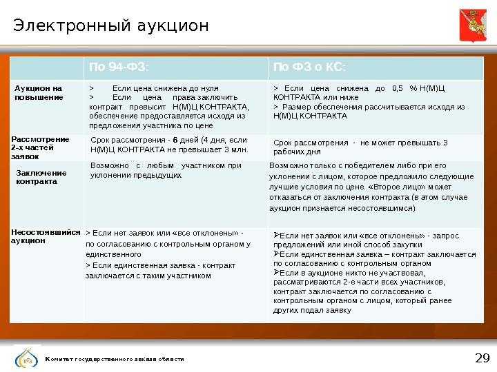 Комитет государственного заказа области 29 Электронный аукцион По 94 -ФЗ: По ФЗ о КС: Аукцион на повышение > Если цена снижена до нуля > Если цена права заключить контракт превысит Н(М)Ц КОНТРАКТА, обеспечение предоставляется исходя из предложения участника по цене > Если цена снижена до 0, 5 % Н(М)Ц КОНТРАКТА или ниже > Размер обеспечения рассчитывается исходя из Н(М)Ц КОНТРАКТА Рассмотрение 2 -х частей заявок Срок рассмотрения — 6 дней (4 дня, если Н(М)Ц КОНТРАКТА не превышает 3 млн. Срок рассмотрения — не может превышать 3 рабочих дня Заключение контракта Возможно с любым участником при уклонении предыдущих Возможно только с победителем либо при его уклонении с лицом, которое предложило следующие лучшие условия по цене. «Второе лицо» может отказаться от заключения контракта (в этом случае аукцион признается несостоявшимся) Несостоявшийся аукцион > Если нет заявок или «все отклонены» — по согласованию с контрольным органом у единственного > Если единственная заявка — контракт заключается с таким участником Если нет заявок или «все отклонены» — запрос предложений или иной способ закупки Если единственная заявка – контракт заключается по согласованию с контрольным органом Если в аукционе никто не участвовал, рассматриваются 2 -е части всех участников, контракт заключается по согласованию с контрольным органом с лицом, который ранее других подал заявку
