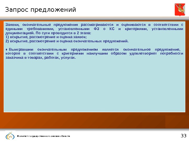 Комитет государственного заказа области 32 Запрос предложений ♦ Новая форма конкурентных закупок, не торги! — способ определения поставщика (подрядчика, исполнителя), при котором информация о потребностях в ТРУ сообщается неограниченному кругу лиц путем размещения в единой информационной системе извещения о проведении запроса предложений, документации о проведении запроса предложений и победителем запроса предложений признается участник закупки, направивший окончательное предложение, которое наилучшим образом удовлетворяет потребностям заказчика в товаре, работе или услуге. ♦ Заказчик вправе проводить в случаях: 1) заключения договора энергоснабжения или договора купли-продажи электрической энергии с гарантирующим поставщиком электрической энергии; 2)заключения контракта на поставки спортивного инвентаря и оборудования, спортивной экипировки, необходимых для подготовки спортивных сборных команд РФ по олимпийским и паралимпийским видам спорта, а также для участия спортивных сборных команд РФ в Олимпийских играх и Паралимпийских играх; 3) заключения ФОИВ в соответствии с установленными Правительством РФ правилами контракта с иностранной организацией на лечение гражданина РФ за пределами территории РФ; 4) заключения контракта на оказание преподавательских услуг, а также услуг экскурсовода (гида) физическими лицами; 5) осуществления закупок дипломатическими представительствами и консульскими учреждениями РФ, торговыми представительствами РФ, официальными представительствами РФ при международных организациях и иными заказчиками, осуществляющими свою деятельность за пределами территории РФ, для обеспечения такой деятельности в случае, если начальная (максимальная) цена контракта не превышает пятнадцать миллионов рублей; 6) осуществления закупки ТРУ, являющихся предметом контракта, расторжение которого осуществлено заказчиком на основании ч. 9 ст. 95 ФЗ о КС; 7) осуществления закупок лекарственных препаратов, которые необходимы для назначения пациенту при наличии медицинских показаний (индивидуальная непереносимость, по жизненным показаниям) по решению врачебной комиссии, которое фиксируется в медицинских документах пациента и журнале врачебной комиссии; 8) признания повторного конкурса, электронного аукциона не состоявшимися в соответствии с ч. 4 ст. 55 и ч. 4 ст. 71 ФЗ о КС; 9) Осуществления закупок изделий народных художественных промыслов, образцы которых зарегистрированы в порядке, установленном уполномоченным Правительством РФ ФОИВ.