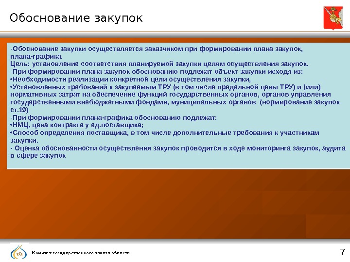 Комитет государственного заказа области 7 Обоснование закупок — Обоснование закупки осуществляется заказчиком при формировании плана закупок, плана-графика. Цель: установление соответствия планируемой закупки целям осуществления закупок. — При формировании плана закупок обоснованию подлежат объект закупки исходя из: • Необходимости реализации конкретной цели осуществления закупки, • Установленных требований к закупаемым ТРУ (в том числе предельной цены ТРУ) и (или) нормативных затрат на обеспечение функций государственных органов, органов управления государственными внебюджетными фондами, муниципальных органов (нормирование закупок ст. 19) — При формировании плана-графика обоснованию подлежат: • НМЦ, цена контракта у ед. поставщика; • Способ определения поставщика, в том числе дополнительные требования к участникам закупки. — Оценка обоснованности осуществления закупок проводится в ходе мониторинга закупок, аудита в сфере закупок