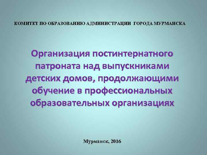 КОМИТЕТ ПО ОБРАЗОВАНИЮ АДМИНИСТРАЦИИ ГОРОДА МУРМАНСКА Организация постинтернатного патроната над выпускниками детских домов, продолжающими обучение в профессиональных образовательных организациях Мурманск, 2016