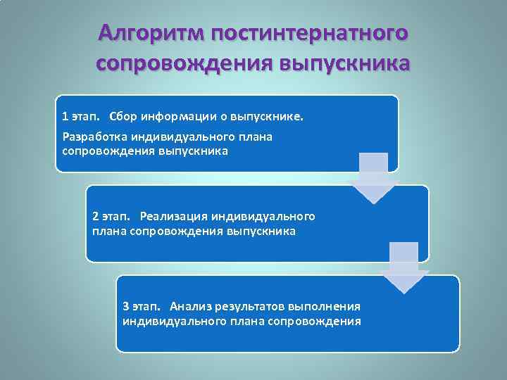 Алгоритм постинтернатного сопровождения выпускника 1 этап. Сбор информации о выпускнике. Разработка индивидуального плана сопровождения выпускника 2 этап. Реализация индивидуального плана сопровождения выпускника 3 этап. Анализ результатов выполнения индивидуального плана сопровождения