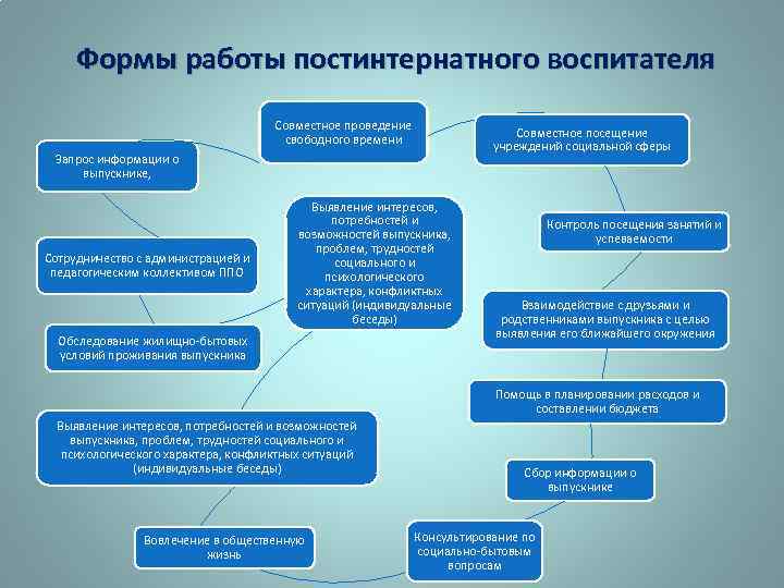 Формы работы постинтернатного воспитателя Совместное проведение свободного времени Запрос информации о выпускнике, Сотрудничество с администрацией и педагогическим коллективом ППО Выявление интересов, потребностей и возможностей выпускника, проблем, трудностей социального и психологического характера, конфликтных ситуаций (индивидуальные беседы) Обследование жилищно-бытовых условий проживания выпускника Совместное посещение учреждений социальной сферы Контроль посещения занятий и успеваемости Взаимодействие с друзьями и родственниками выпускника с целью выявления его ближайшего окружения Помощь в планировании расходов и составлении бюджета Выявление интересов, потребностей и возможностей выпускника, проблем, трудностей социального и психологического характера, конфликтных ситуаций (индивидуальные беседы) Вовлечение в общественную жизнь Сбор информации о выпускнике Консультирование по социально-бытовым вопросам