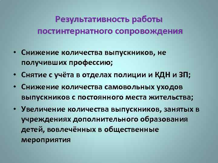 Результативность работы постинтернатного сопровождения • Снижение количества выпускников, не получивших профессию; • Снятие с учёта в отделах полиции и КДН и ЗП; • Снижение количества самовольных уходов выпускников с постоянного места жительства; • Увеличение количества выпускников, занятых в учреждениях дополнительного образования детей, вовлечённых в общественные мероприятия
