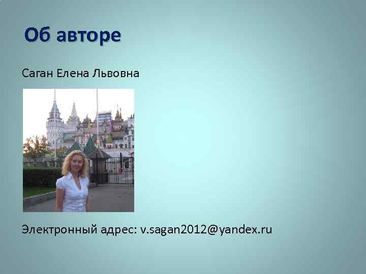 Об авторе Саган Елена Львовна Электронный адрес: v. sagan 2012@yandex. ru