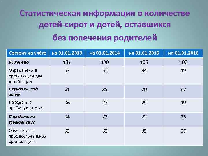 Статистическая информация о количестве детей-сирот и детей, оставшихся без попечения родителей Состоит на учёте на 01. 2013 на 01. 2014 на 01. 2015 на 01. 2016 Выявлено 137 130 106 100 Определены в организации для детей-сирот 57 50 34 19 Переданы под опеку 61 85 70 67 Переданы в приёмную семью 36 23 29 19 Переданы на усыновление 34 23 23 25 Обучаются в профессиональных организациях 32 32 35 37