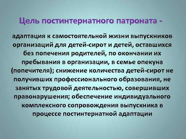 Цель постинтернатного патроната адаптация к самостоятельной жизни выпускников организаций для детей-сирот и детей, оставшихся без попечения родителей, по окончании их пребывания в организации, в семье опекуна (попечителя); снижение количества детей-сирот не получивших профессионального образования, не занятых трудовой деятельностью, совершивших правонарушения; обеспечение индивидуального комплексного сопровождения выпускника в процессе постинтернатной адаптации