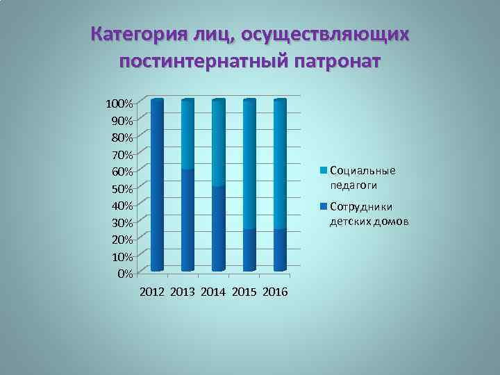 Категория лиц, осуществляющих постинтернатный патронат 100% 90% 80% 70% 60% 50% 40% 30% 20% 10% 0% Социальные педагоги Сотрудники детских домов 2012 2013 2014 2015 2016