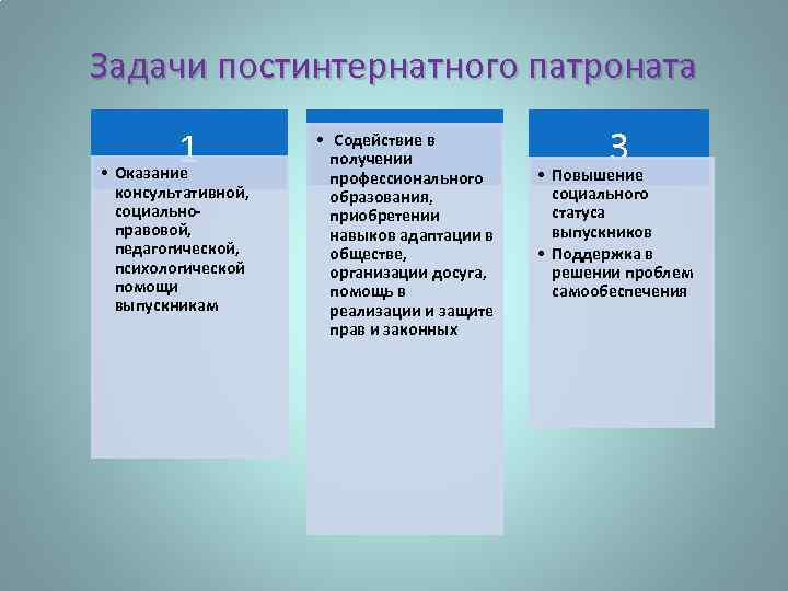 Задачи постинтернатного патроната - Содействие в получении профессионального образования, приобретении навыков адаптации в обществе, организации и проведении досуга; -Помощь в реализации и защите прав и законных интересов; - Оказание консультативной, социально-правовой, педагогической и психологической помощи выпускникам; - Повышение социального статуса выпускников; - Поддержка в решении проблем самообеспечения