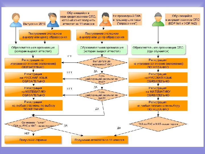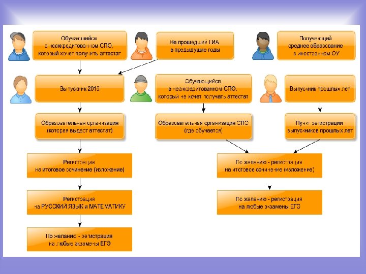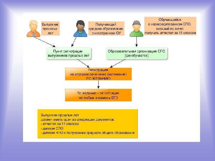 Комитет по образованию Санкт-Петербурга Блок-схема прохождения ГИА по программам среднего общего образования для обучающихся СПО ГИА по программам среднего общего образования ГИА по программам СПО Получение документа о среднем профессиональном образовании Статус: выпускник прошлых лет С получением аттестата Регистрация в аккредитованной ОО (ЦО, КОР № 1, 2) Сочинение (обязательно) Протокол педсовета ОО о допуске к ГИА ВУЗ по специальности Без получения аттестата Регистрация в своих ОО через ответственного за ГИА Сочинение (по желанию) Справка об освоении образовательных программ среднего общего образования ГИА аттестат и ВУЗ