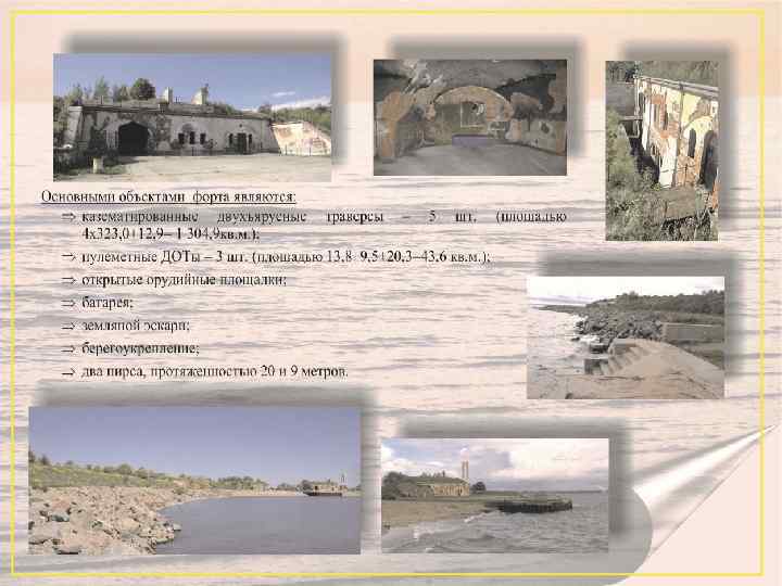Строения Казематы : Кирпичные сооружения, со сводчатыми потолками построенные в середине XIX века. Общая площадь каземата, включающая в себя два этажа — 323 м 2. Беседки с мангалом и шампурами расположенные в живописных местах форта с шикарным видом на финский залив.