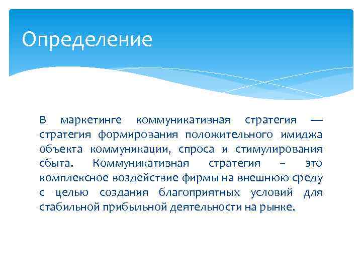 Определение В маркетинге коммуникативная стратегия — стратегия формирования положительного имиджа объекта коммуникации, спроса и стимулирования сбыта. Коммуникативная стратегия – это комплексное воздействие фирмы на внешнюю среду с целью создания благоприятных условий для стабильной прибыльной деятельности на рынке.