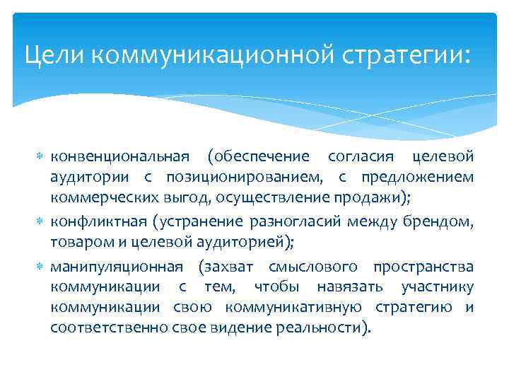 Цели коммуникационной стратегии: конвенциональная (обеспечение согласия целевой аудитории с позиционированием, с предложением коммерческих выгод, осуществление продажи); конфликтная (устранение разногласий между брендом, товаром и целевой аудиторией); манипуляционная (захват смыслового пространства коммуникации с тем, чтобы навязать участнику коммуникации свою коммуникативную стратегию и соответственно свое видение реальности).