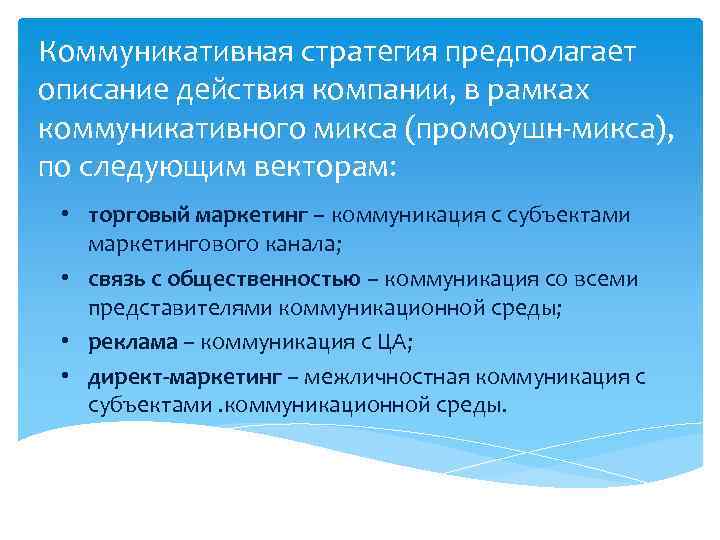 Коммуникативная стратегия предполагает описание действия компании, в рамках коммуникативного микса (промоушн-микса), по следующим векторам: • торговый маркетинг – коммуникация с субъектами маркетингового канала; • связь с общественностью – коммуникация со всеми представителями коммуникационной среды; • реклама – коммуникация с ЦА; • директ-маркетинг – межличностная коммуникация с субъектами. коммуникационной среды.
