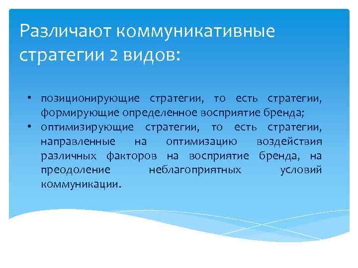 Различают коммуникативные стратегии 2 видов: • позиционирующие стратегии, то есть стратегии, формирующие определенное восприятие бренда; • оптимизирующие стратегии, то есть стратегии, направленные на оптимизацию воздействия различных факторов на восприятие бренда, на преодоление неблагоприятных условий коммуникации.