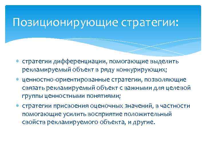 Позиционирующие стратегии: стратегии дифференциации, помогающие выделить рекламируемый объект в ряду конкурирующих; ценностно-ориентированные стратегии, позволяющие связать рекламируемый объект с важными для целевой группы ценностными понятиями; стратегии присвоения оценочных значений, в частности помогающие усилить восприятие положительный свойств рекламируемого объекта, и другие.