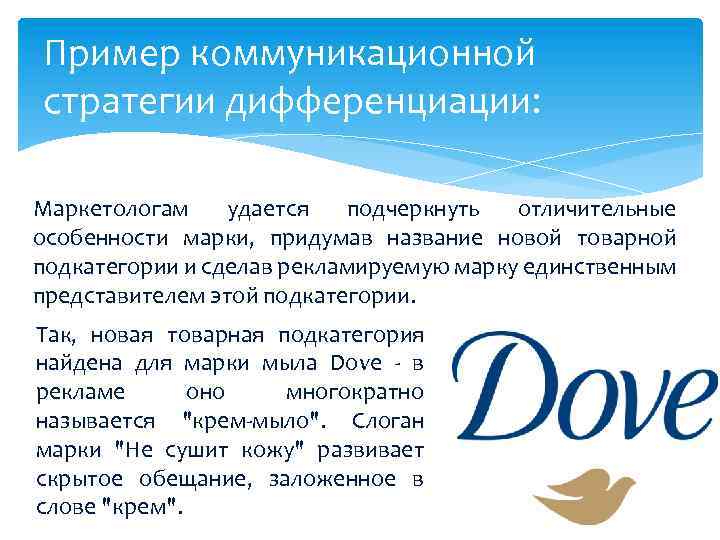 Пример коммуникационной стратегии дифференциации: Маркетологам удается подчеркнуть отличительные особенности марки, придумав название новой товарной подкатегории и сделав рекламируемую марку единственным представителем этой подкатегории. Так, новая товарная подкатегория найдена для марки мыла Dove - в рекламе оно многократно называется "крем-мыло". Слоган марки "Не сушит кожу" развивает скрытое обещание, заложенное в слове "крем".