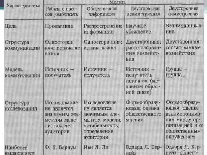 • Дж. Грюниг и Т. Хант выделяют четыре типа организации работы по налаживанию связей и используют их в качестве моделей теории и практики связей с общественностью.
