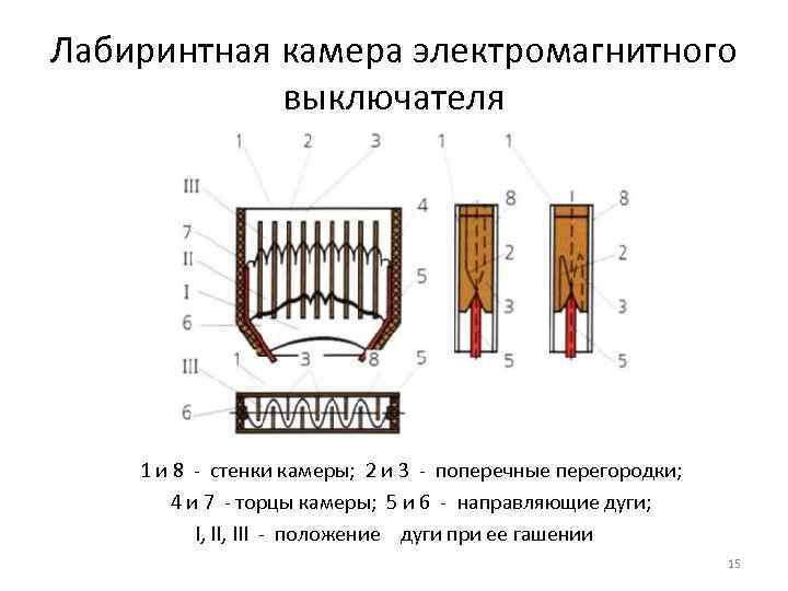 Лабиринтная камера электромагнитного выключателя 1 и 8 - стенки камеры; 2 и 3 - поперечные перегородки; 4 и 7 - торцы камеры; 5 и 6 - направляющие дуги; I, III - положение дуги при ее гашении 15