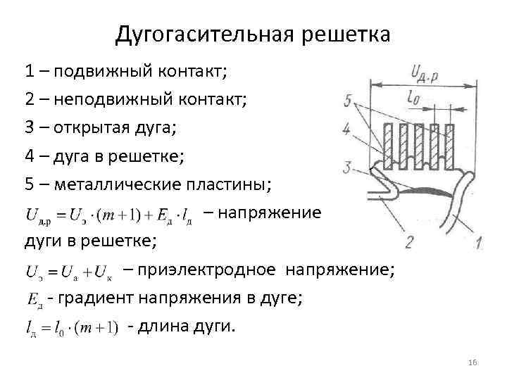 Дугогасительная решетка 1 – подвижный контакт; 2 – неподвижный контакт; 3 – открытая дуга; 4 – дуга в решетке; 5 – металлические пластины; – напряжение дуги в решетке; – приэлектродное напряжение; - градиент напряжения в дуге; - длина дуги. 16