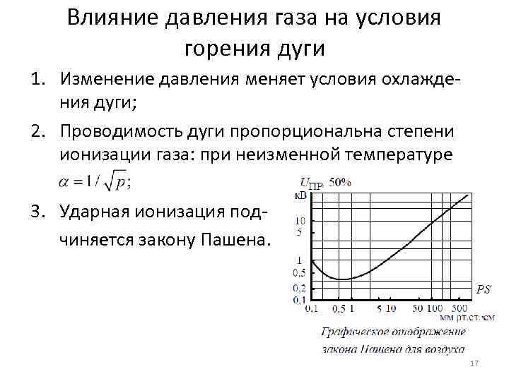 Влияние давления газа на условия горения дуги 1. Изменение давления меняет условия охлаждения дуги; 2. Проводимость дуги пропорциональна степени ионизации газа: при неизменной температуре 3. Ударная ионизация подчиняется закону Пашена. 17