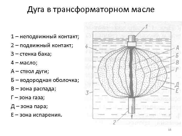 Дуга в трансформаторном масле 1 – неподвижный контакт; 2 – подвижный контакт; 3 – стенка бака; 4 – масло; А – ствол дуги; Б – водородная оболочка; В – зона распада; Г – зона газа; Д – зона пара; Е – зона испарения. 18