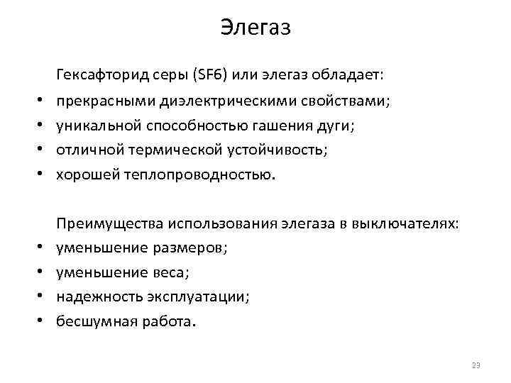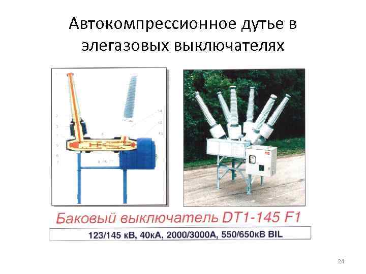 Элегаз Гексафторид серы (SF 6) или элегаз обладает: • • прекрасными диэлектрическими свойствами; уникальной способностью гашения дуги; отличной термической устойчивость; хорошей теплопроводностью. Преимущества использования элегаза в выключателях: уменьшение размеров; уменьшение веса; надежность эксплуатации; бесшумная работа. 23