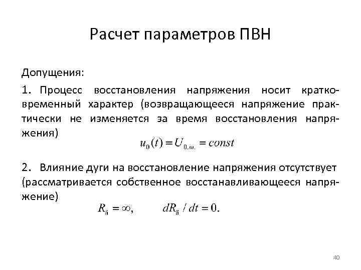 Расчет параметров ПВН Допущения: 1. Процесс восстановления напряжения носит кратковременный характер (возвращающееся напряжение практически не изменяется за время восстановления напряжения) 2. Влияние дуги на восстановление напряжения отсутствует (рассматривается собственное восстанавливающееся напряжение) 40