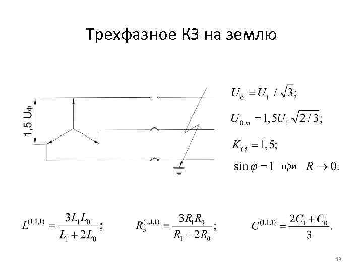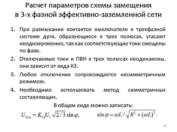 Расчет параметров схемы замещения в 3 -х фазной эффективно-заземленной сети 1. При размыкании контактов выключателя в трехфазной системе дуги, образующиеся в трех полюсах, угасают неодновременно, так как соответствующие токи смещены по фазе. 2. Отключаемые токи и ПВН в трех полюсах неодинаковы, они зависят от вида КЗ. 3. Любое отключение сопровождается несимметричным режимом. 4. Необходимо использовать метод симметричных составляющих. В общем виде можно записать: 42