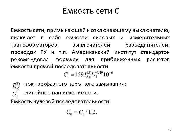Емкость сети С Емкость сети, примыкающей к отключающему выключателю, включает в себя емкости силовых и измерительных трансформаторов, выключателей, разъединителей, проводов РУ и т. п. Американский институт стандартов рекомендовал формулу для приближенных расчетов емкости прямой последовательности: - ток трехфазного короткого замыкания; - линейное напряжение сети. Емкость нулевой последовательности: 49