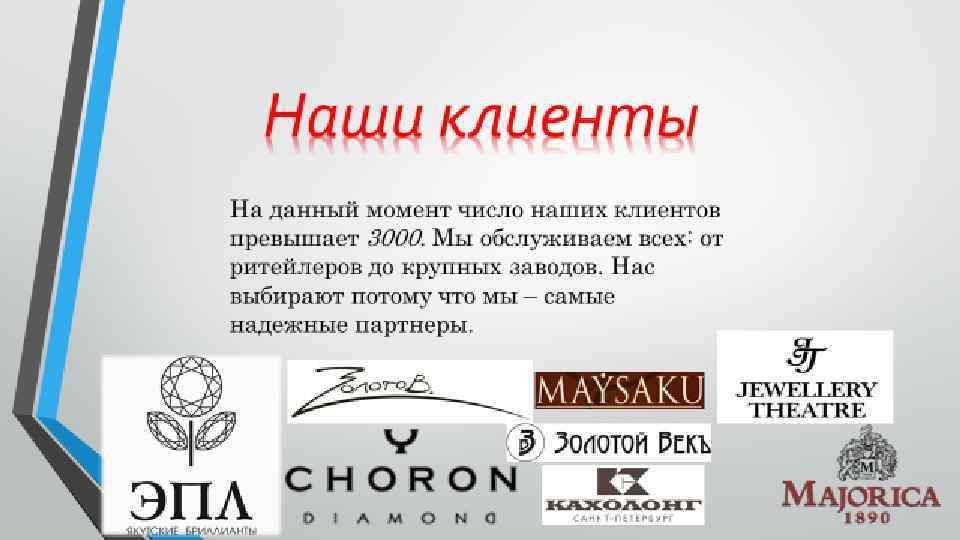 Компания IDSOFT появилась на рынке более 10 лет назад. Специализируется на предоставлении услуг и различного торгового оборудования ювелирным компаниям. На данный момент в компании действует более 5 отделов: 1. Финансовый 2. Маркетинговый 3. Отдел технической поддержки 4. Отдел программирования 5. Отдел разработок 6. Прочие отделы по удаленной работе с клиентами С момента открытия, основатели и весь дружный коллектив IDSOFT трудились ради достижения передовых технологий в различных отраслях. За недолгие годы работы нашей компании, мы добились больших успехов и вышли на Европейский рынок. А также нашими специалистами было написано уже более сотни программ для ювелирного учета. Ключевым приоритетом в нашей работе является готовность полностью обеспечить наших клиентов необходимыми программами, бирками, и усовершенствованным оборудованием. То что продаем мы - нет ни у кого!