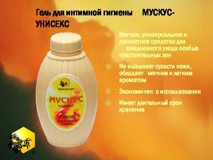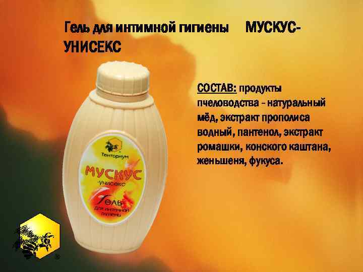 Гель для интимной гигиены УНИСЕКС МУСКУС- СОСТАВ: продукты пчеловодства - натуральный мёд, экстракт прополиса водный, пантенол, экстракт ромашки, конского каштана, женьшеня, фукуса.