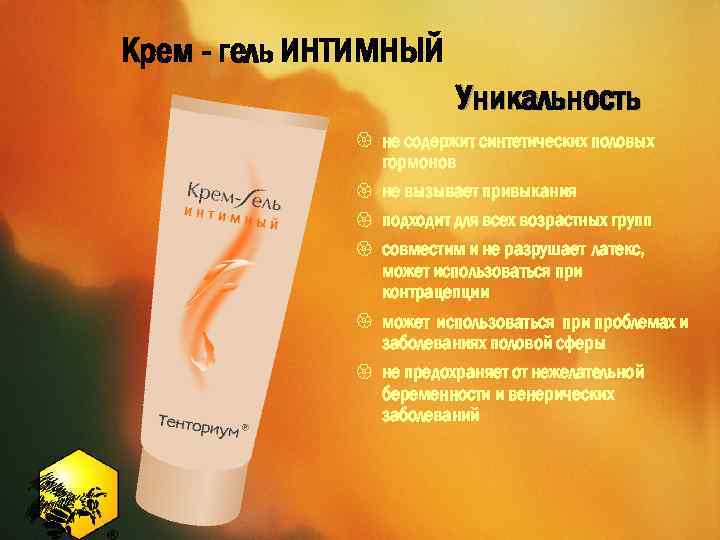 Крем - гель ИНТИМНЫЙ Уникальность { не содержит синтетических половых гормонов { не вызывает привыкания { подходит для всех возрастных групп { совместим и не разрушает латекс, может использоваться при контрацепции { может использоваться при проблемах и заболеваниях половой сферы { не предохраняет от нежелательной беременности и венерических заболеваний