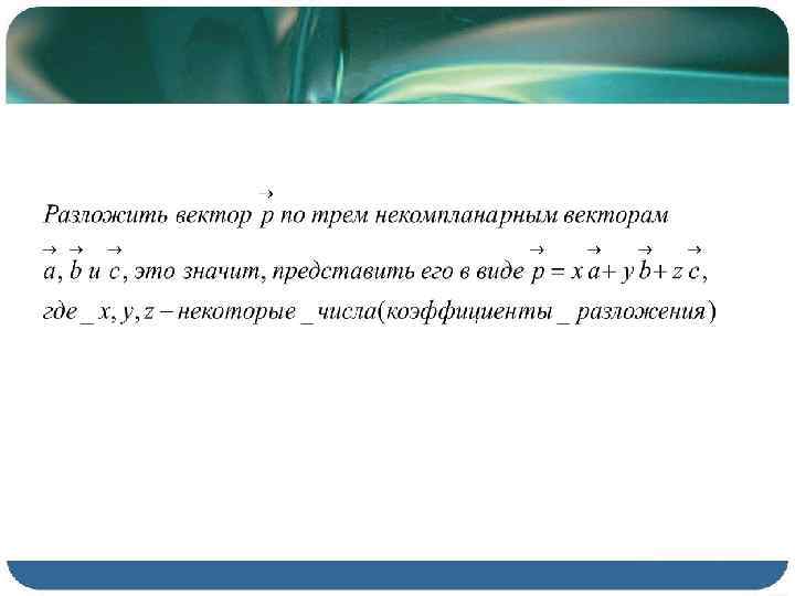 Теорема о разложении вектора по трём некомпланарным векторам Любой вектор можно разложить по трем данным некомпланарным векторам, причём коэффициенты разложения определяются единственным образом.