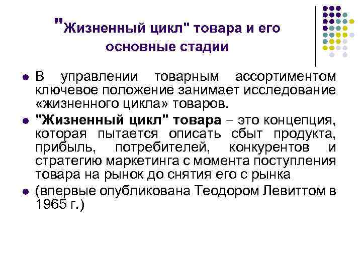 "Жизненный цикл" товара и его основные стадии l l l В управлении товарным ассортиментом ключевое положение занимает исследование «жизненного цикла» товаров. "Жизненный цикл" товара это концепция, которая пытается описать сбыт продукта, прибыль, потребителей, конкурентов и стратегию маркетинга с момента поступления товара на рынок до снятия его с рынка (впервые опубликована Теодором Левиттом в 1965 г. )