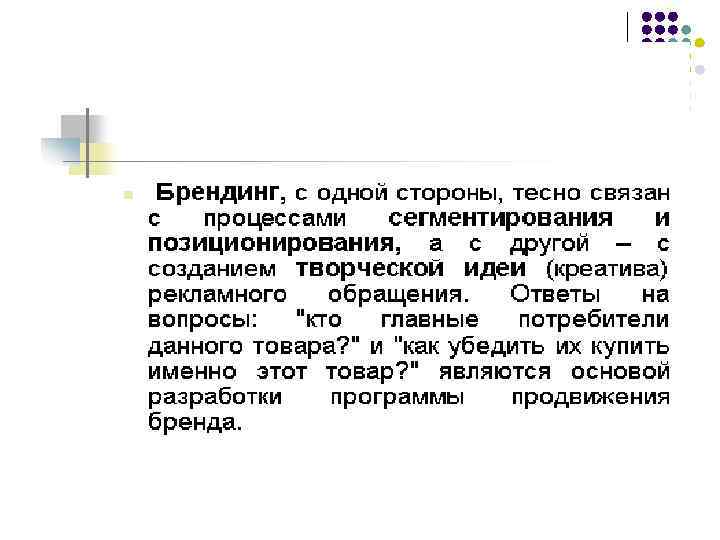 Что такое брэндинг? l Брэндинг – это активный процесс отношений и взаимоотношений, которые вы устанавливаете с миром посредством своего брэнда l Брэнд – это позиционированная марка
