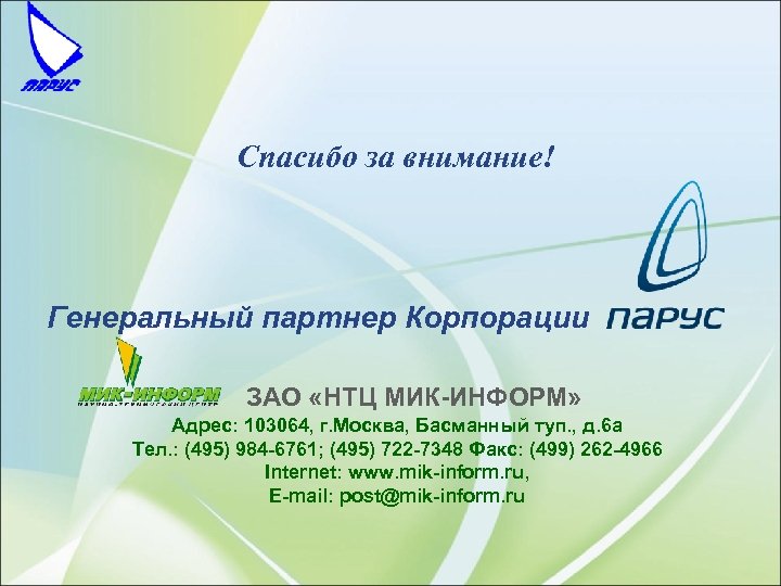 Спасибо за внимание! Генеральный партнер Корпорации ЗАО «НТЦ МИК-ИНФОРМ» Адрес: 103064, г. Москва, Басманный туп. , д. 6 а Тел. : (495) 984 -6761; (495) 722 -7348 Факс: (499) 262 -4966 Internet: www. mik-inform. ru, E-mail: post@mik-inform. ru