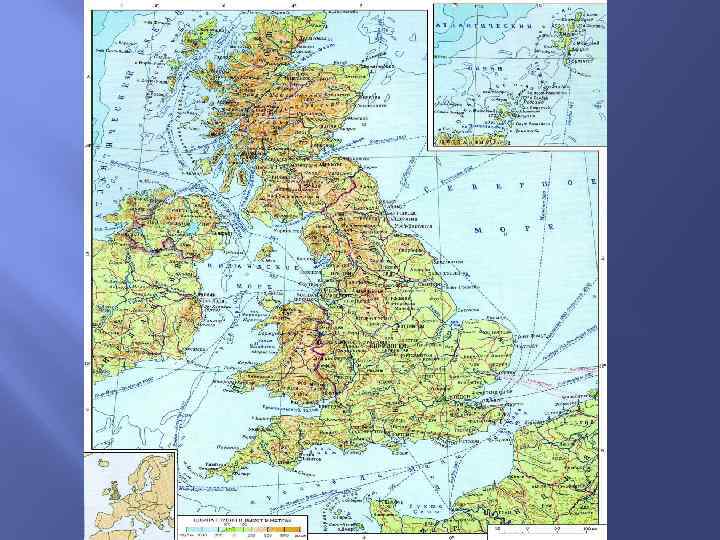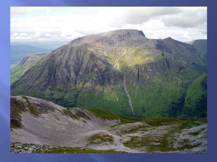 Рельеф Великобритании Большая часть территории Англии — низменности, только на северо западе страны расположены Камберлендские и Пеннинские горы, а на крайнем юго западе — холмы Эксмура и Дартмура. В рельефе Шотландии особенно выделяется тектонический разлом между Среднешотландской низменностью и Северо Шотландским нагорьем. Последнее включает в себя Грампианские горы с наивысшей точкой Великобритании — горой Бен Невис.