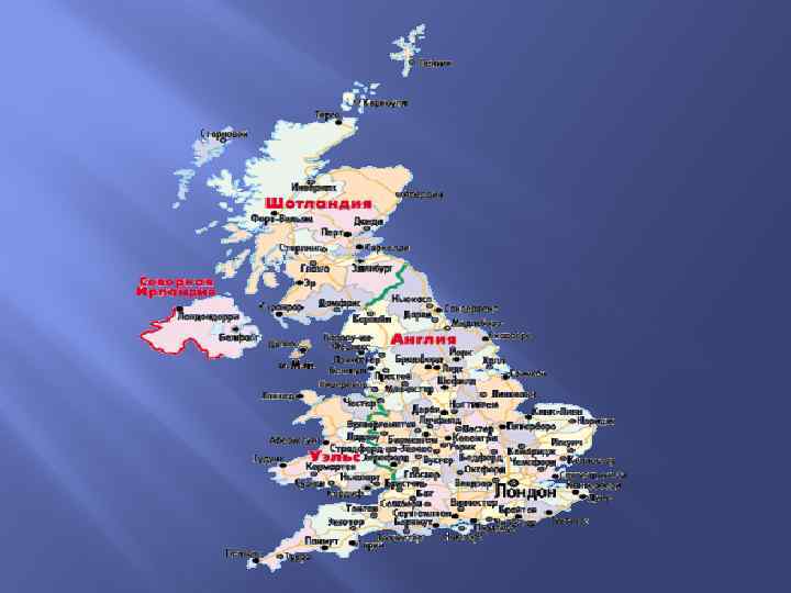 Столица — город Лондон, один из крупнейших городов Европы и важнейший мировой финансово экономический центр. Крупнейшие города: Лондон, Бирмингем, Глазго, Белфаст, Манчестер, Эдинбург, Ливерпуль