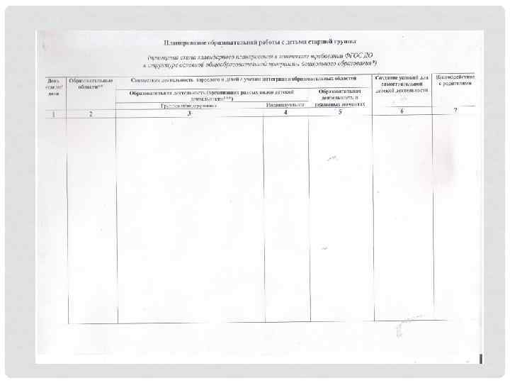 • Сетка непрерывной непосредственно образовательной деятельности • Подневный план 1 и 2 половина дня v по 5 образовательным областям (совместная и самостоятельная деятельность) v. Коррекционная работа v. Предметно-пространственная среда v. Работа с родителями