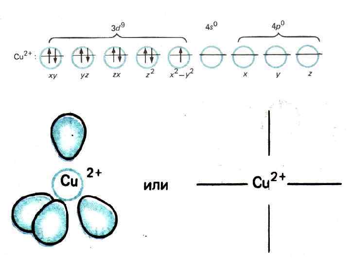 МЕХАНИЗМ ОБРАЗОВНИЯ К. С. Теория ВС: гибридизация центрального атома и донорно-акцепторный механизм. Центральный ион – акцептор электронов (электронный дефицит). Лиганды – доноры электронной пары за счет неподеленной электронной пары (атома N, O, S, галогенов). Сu 2+ 3 d 94 s 04 p 0 sp 3 -гибридизация