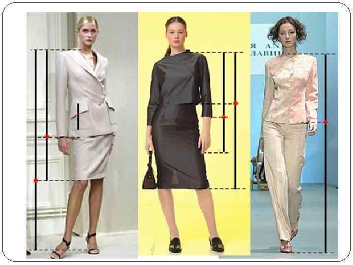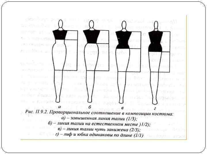 2. Пропорциональность в соотношении частей костюма Пропорциональность – необходимое условие существования художественного решения изделия. Подобие тел, характеризующееся равенством отношений размеров, называется пропорцией (лат. proportio – соразмерность). Масштаб изделия определяют, сопоставляя его размеры с фиксированным размером, принятым за эталон.