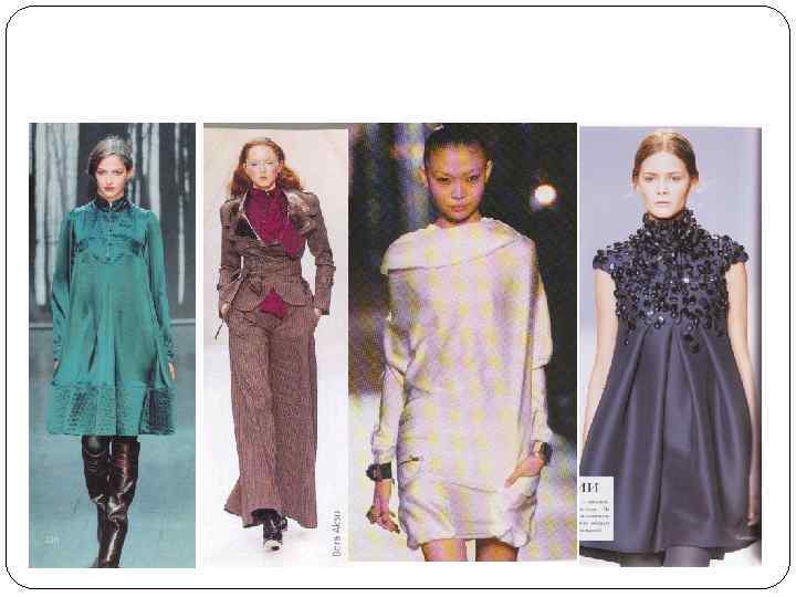Форма костюма может быть организована и по правилам контраста – не из подобных фигур. Важно, чтобы размерные отношения между элементами были не случайными, а закономерными. Пропорционирование форм костюма самым тесным образом связано с тектоникой формы. Упорядочение форм из жёсткого материала есть поиск формообразующих средств в виде швов – членений конструкции, которые должны быть подчинены определенному ритму. Мягкая пластичная ткань позволяет получить объёмные формы с минимальным количеством швов. Упорядочение масс форм в этом случае происходит легче, но также включаются элементы, которые необходимо ритмизировать: драпировки, складки, фалды. Очевидно, пропорционирование связано с пластическими свойствами материалов.