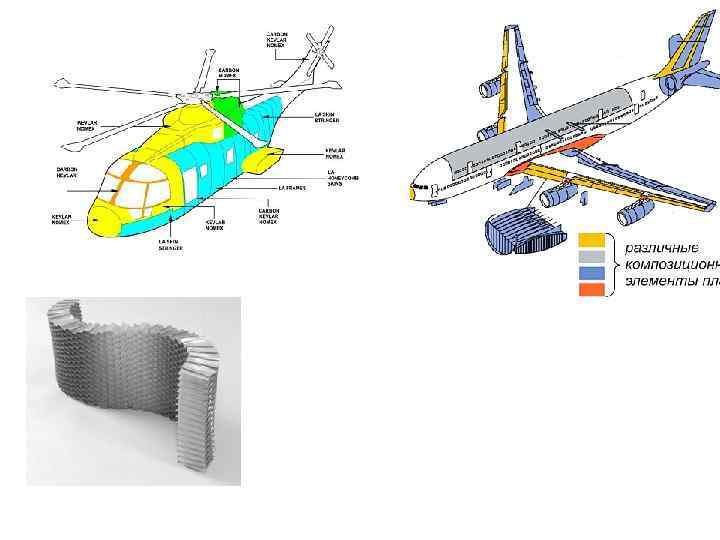 применение Композиционные материалы применяют во многих отраслях промышленности, и прежде всего в авиации, ракетной и космической технике, где особое значение имеет снижение массы конструкции при одновременном повышении прочности и жесткости (горизонтальные стабилизаторы, закрылки, лопасти винтов, корпусы и камеры сгорания реактивных двигателей и др. ). Это позволяет уменьшить на 30 -40% массу, увеличить полезную нагрузку без снижения скорости. В настоящее время композиционные материалы применяют в энергетическом турбостроении (рабочие и силовые лопатки турбин), в автомобилестроении (кузова автомобилей, детали двигателей), в машиностроении, в химической промышленности (автоклавы, цистерны, емкости), в судостроении (гребные винты, корпуса лодок) и др. Широко применяют композиционные материалы в качестве электроизоляционных материалов (органоволокниты), радиопрозрачных обтекателей (стекловолокниты), подшипников скольжения (карбоволокниты) и др.