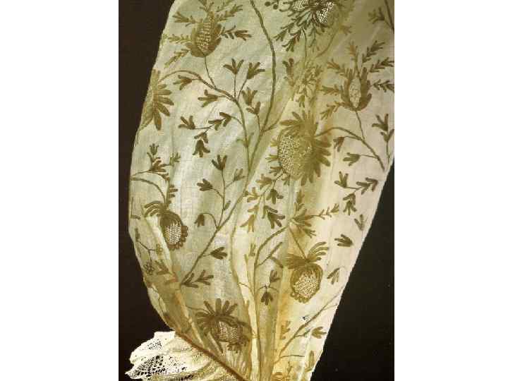 КОМПОЗИЦИЯ КОСТЮМА: 1. РУБАХА «РУКАВА» , СОСТАВНАЯ С ДЛИННЫМИ ШИРОКИМИ РУКАВАМИ, СОБРАННЫМИ У КИСТИ, ИЗ ТОНКОЙ ЛЬНЯНОЙ ТКАНИ И БАТИСТА, УКРАШЕНА ВЫШИВКОЙ БЕЛОЙ НИТЬЮ ТАМБУРНЫМ ШВОМ, «РЕШЁТКАМИ» , НАСТИЛОМ, ПО КРАЮ РУКАВОВ ПРИШИТА КРУЖЕВНАЯ ОБОРКА 2. САРАФАН КОСОКЛИННЫЙ, РАСПАШНОЙ, УКРАШЕН ЗОЛОТЫМ ЗУБЧАТЫМ ГАЛУНОМ ИЗ РУБЧАТОЙ ФАБРИЧНОЙ ТКАНИ РУССКОЙ РАБОТЫ, 2 ПОЛОВИНА 19 В. 3. КИСЕЙНЫЙ ПЛАТОК С ВЫШИВКОЙ ЗОЛОТЫМИ И СЕРЕБРЯНЫМИ НИТЯМИ, УКРАШЕН РОЗОВЫМ ЗУБЧАТЫМ КРУЖЕВОМ 4. ЦЕПОЧКА СЕРЕБРЯНАЯ С ЭМАЛЬЮ