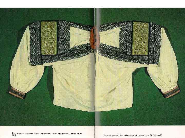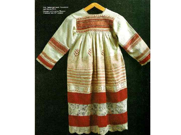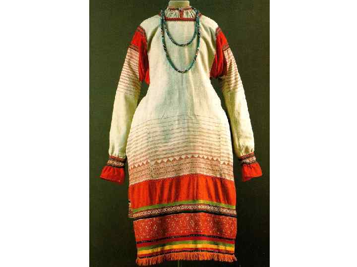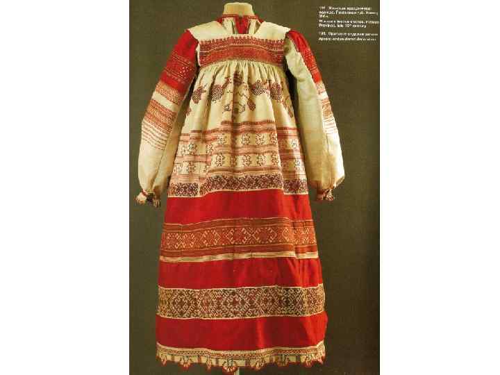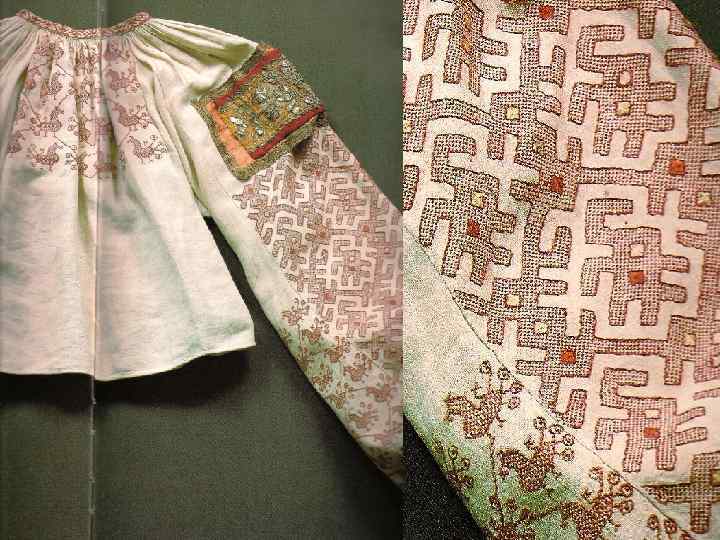 «ДЕВИЧЬЯ ПРАЗДНИЧНАЯ ОДЕЖДА. ОЛОНЕЦКАЯ ГУБ. КАРГОПОЛЬСКИЙ У. 1 ПОЛОВИНА 19 В. » РУБАХА БЕЗ ПОЛИКОВ С «НАМЫШНИКАМИ» С ДЛИННЫМИ РУКАВАМИ, СОБРАННЫМИ У КИСТИ, ИЗ ДОМОТКАНОГО ХОЛСТА, УКРАШЕНА УЗОРНЫМ ТКАЧЕСТВОМ, ВЫШИВКОЙ СЧЁТНЫМИ ШВАМИ, ШЁЛКОВЫМИ И ЛЬНЯНЫМИ РАЗНОЦВЕТНЫМИ НИТЯМИ
